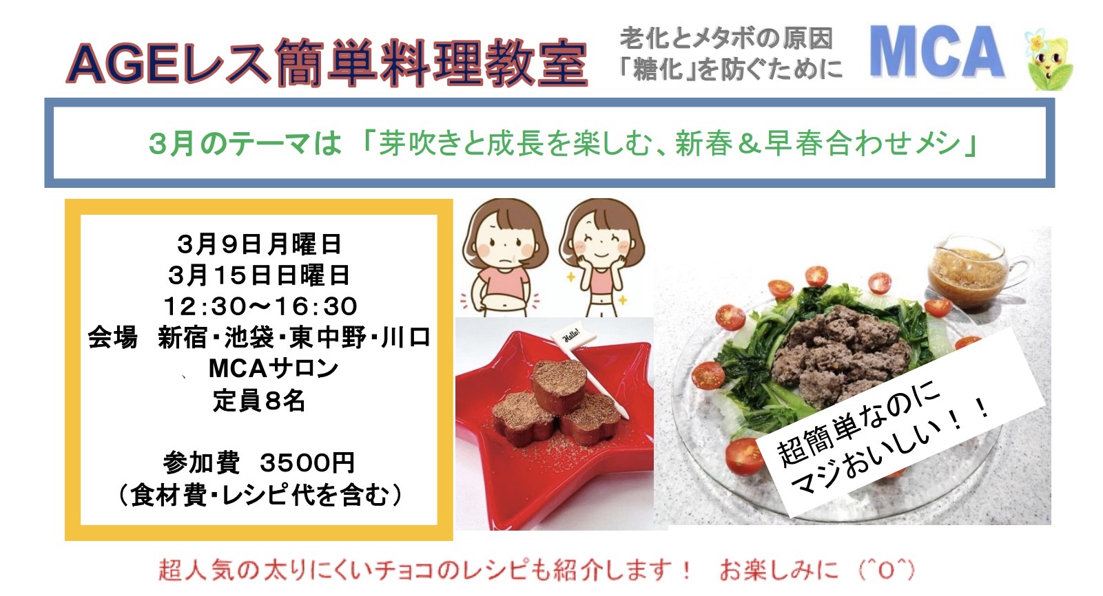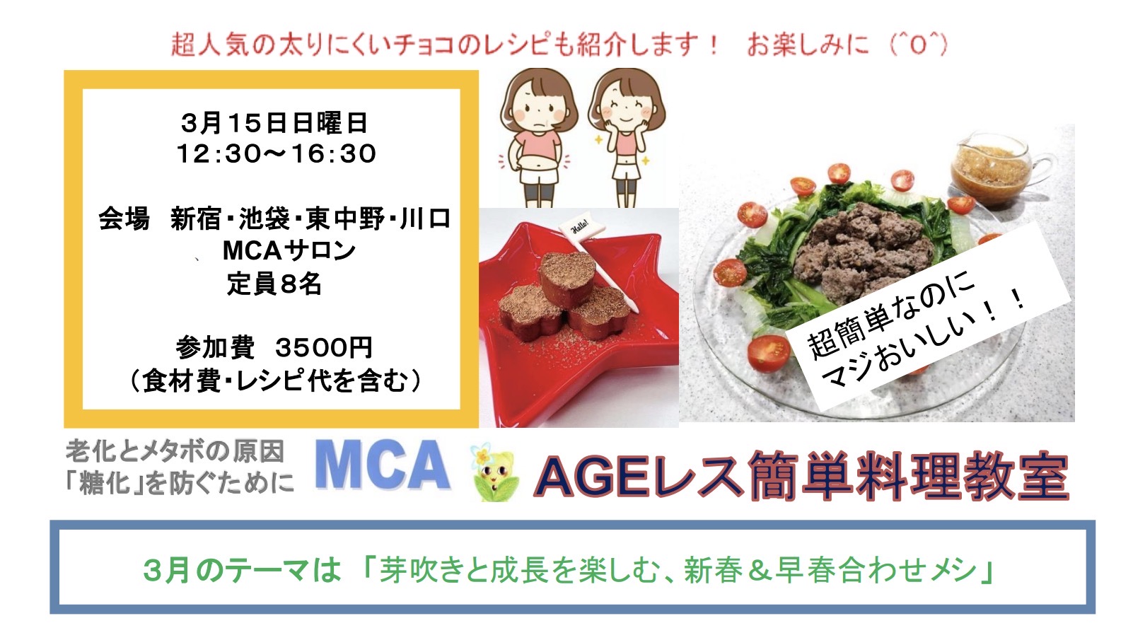 3月AGEレス(糖化レス)簡単料理教室のテーマは 「芽吹きと成長を楽しむ、新春&早春合わせメシ」 3月15日日曜日 12時30分~16時30分 受付12時15分 参加費3500円 (レシピ、テキスト代、AGE測定費用含む…