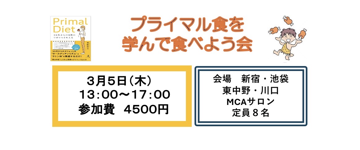 プライマル食を学んで食べよう会のご案内 3月5日木曜日 13時〜17時 受付12時45分 開催場所 MCAサロンにて 新宿・池袋・東中野・川口等随時開催中 定員8名 参加費4500円 お申込みは開催日の21日前までに、又…